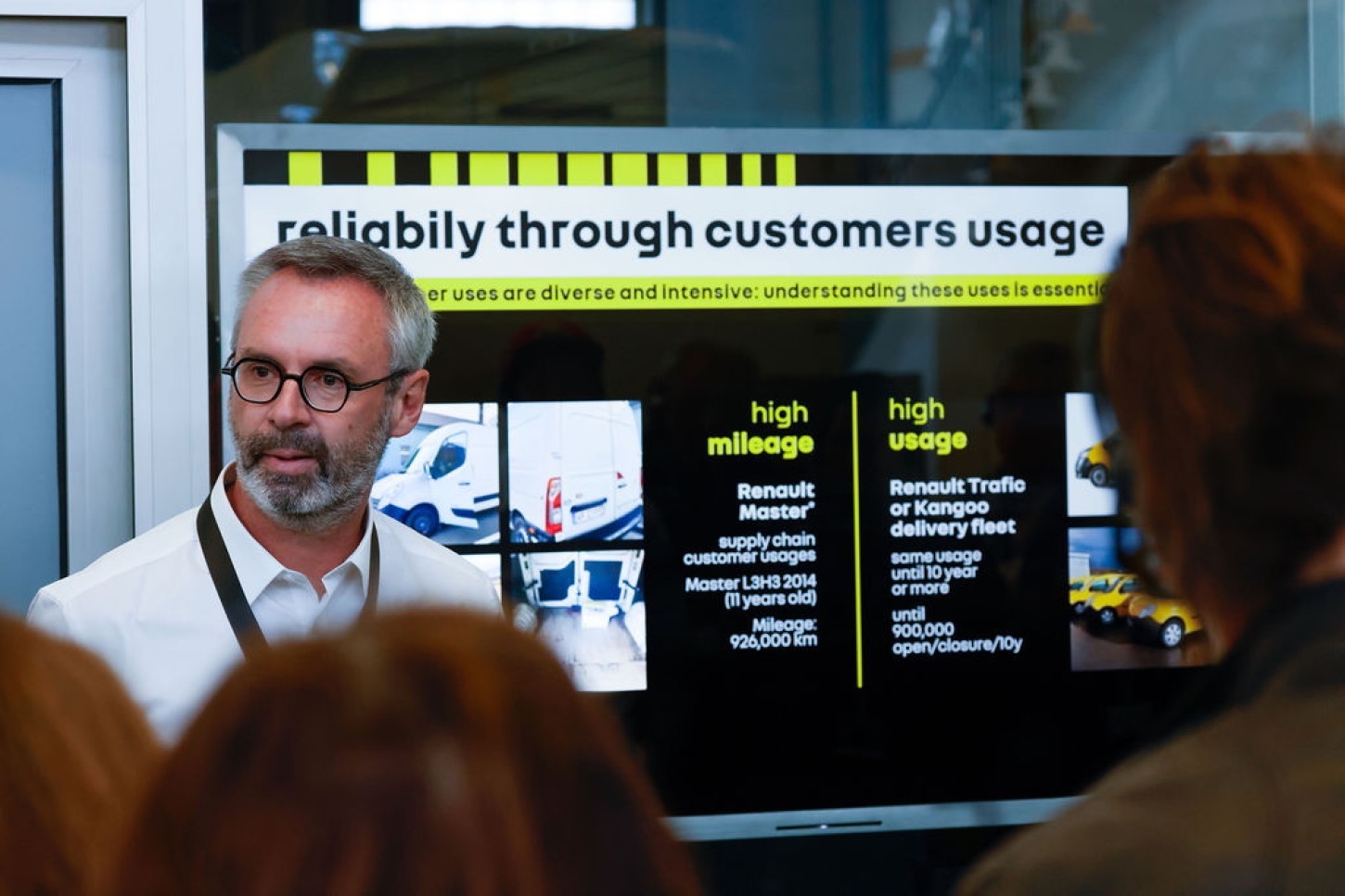 Een elektrische Renault moet net zo bedrijfszeker zijn als een diesel. Daar maakt het merk geen enkel verschil in. De norm is duidelijk: een bedrijfswagen moet tien jaar en 900.000 kilometer meegaan. Dat vraagt om extreme tests die ver buiten het normale gebruik gaan. De ontwikkelaars noemen hun werkplek niet voor niets de martelkamers van Renault. Hier staan tientallen testbanken waarop bestelwagens maandenlang 24 uur per dag worden beproefd, tot hun maximale toegestane gewicht volgeladen. Ze stuiteren op hydraulische platforms die een slecht wegdek nabootsen, krijgen duizenden keren hun deuren dichtgeslagen en hun stoelen ingedrukt alsof een chauffeur 450.000 keer in- en uitstapt.