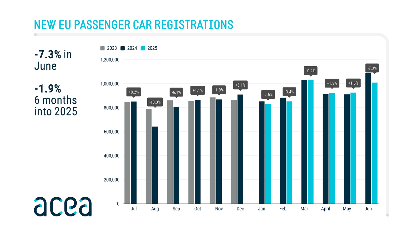 De autoverkoop in Europa liep in de eerste helft van 2025 licht terug. Ten opzichte van vorig jaar daalde het aantal nieuwe registraties met bijna 2%. Elektrische auto’s winnen daarentegen met meer dan 3%. Tussen januari en juni werden er in de EU 869.271 volledig elektrische auto’s geregistreerd. Dat is goed voor 15,6% van de markt, waar dat vorig jaar nog 12,5% was. De groei komt vooral op naam van Duitsland (+35%), België (+20%) en Nederland (+6%). In Frankrijk gingen de aantallen juist omlaag, met een daling van ruim 6%.