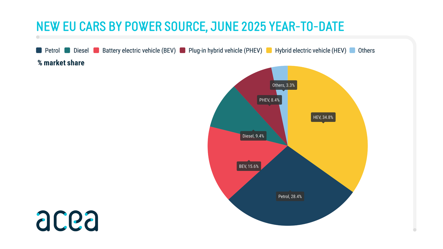 De hybride blijft voorlopig het populairst onder Europese kopers. Met bijna twee miljoen registraties zijn mild- en full-hybrides samen goed voor een marktaandeel van 34,8%. In Frankrijk, Spanje, Italië en Duitsland zit de groei stevig in de lift.