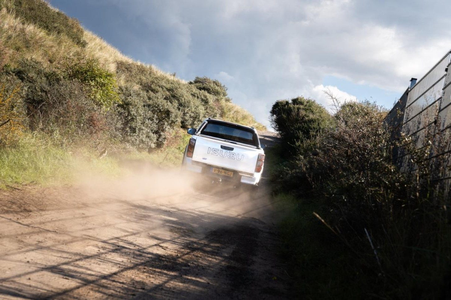 Tijdens het wegrijden valt ook op dat alles met name gericht is op het hoge trekgewicht. De Isuzu sprint er niet vandoor, zoals zoveel EV's. Het vermogen komt mooi en gedosseerd, ook bij lomp het gas instampen. Tijdens de off-road route die is uitgestippeld blijkt dit ook gewoon erg prettig. Het gevolg van een mooie soepele vermogensafgifte is namelijk grip en controle. En dit heeft de Isuzu D-Max dan ook! Stijle klimmetjes in mul zand, steile afdalingen, de D-mMax EV doet het allemaal zeer beheerst en geeft geen krimp. Enig minpuntje dat wij konden ontdekken is het toch wel erg lichte stuurgevoel. Dit draagt misschien bij aan het zeer gemoedelijke en beheerste karakter, maar de keerzijde is dat het allemaal wel erg vaag aanvoelt. Waardoor er eigenlijk geen idee is over wat de voorwielen nu precies doen.