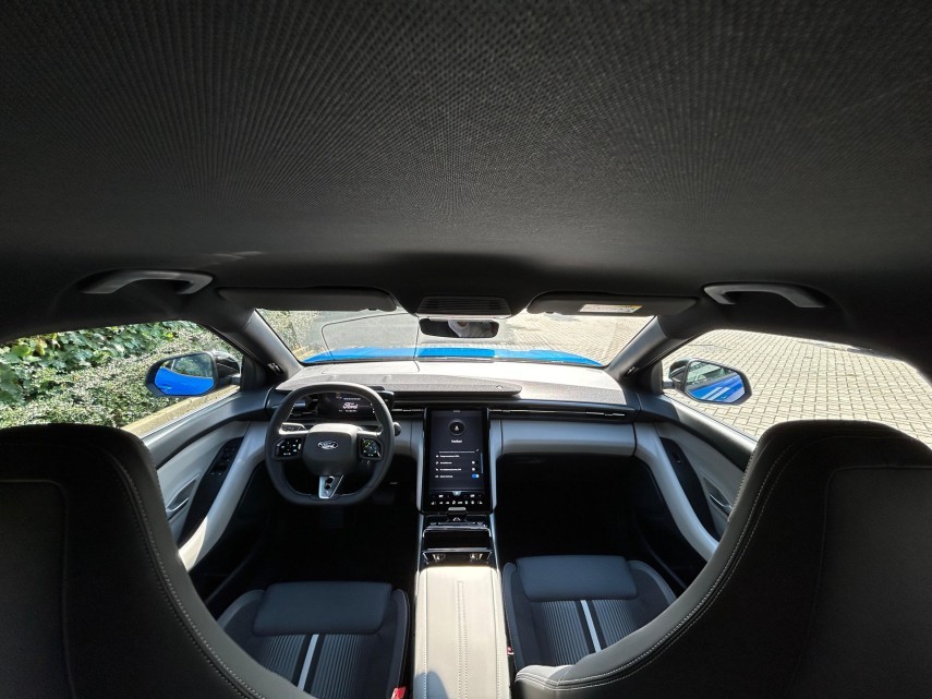 Die andere styling zie je ook terug in de laadruimte. Die is een stuk groter dan die van de elektrische Ford Explorer. Dat doen ze door de auto langer te maken en niet zo’n beetje ook. Die is namelijk 463 cm, maar liefst 16 centimeter maar dan de Explorer. Daardoor heb je een belachelijk grote kofferbak van 572 liter. De grootste in zijn klasse. Helaas komt die extra lengte niet ten goede voor de passagiers op de achterbank. Die moeten het doen met evenveel beenruimte - die overigens niet krap is. Met 1.85 meter achter jezelf zitten is prima te doen en ook de hoofdruimte is prima.