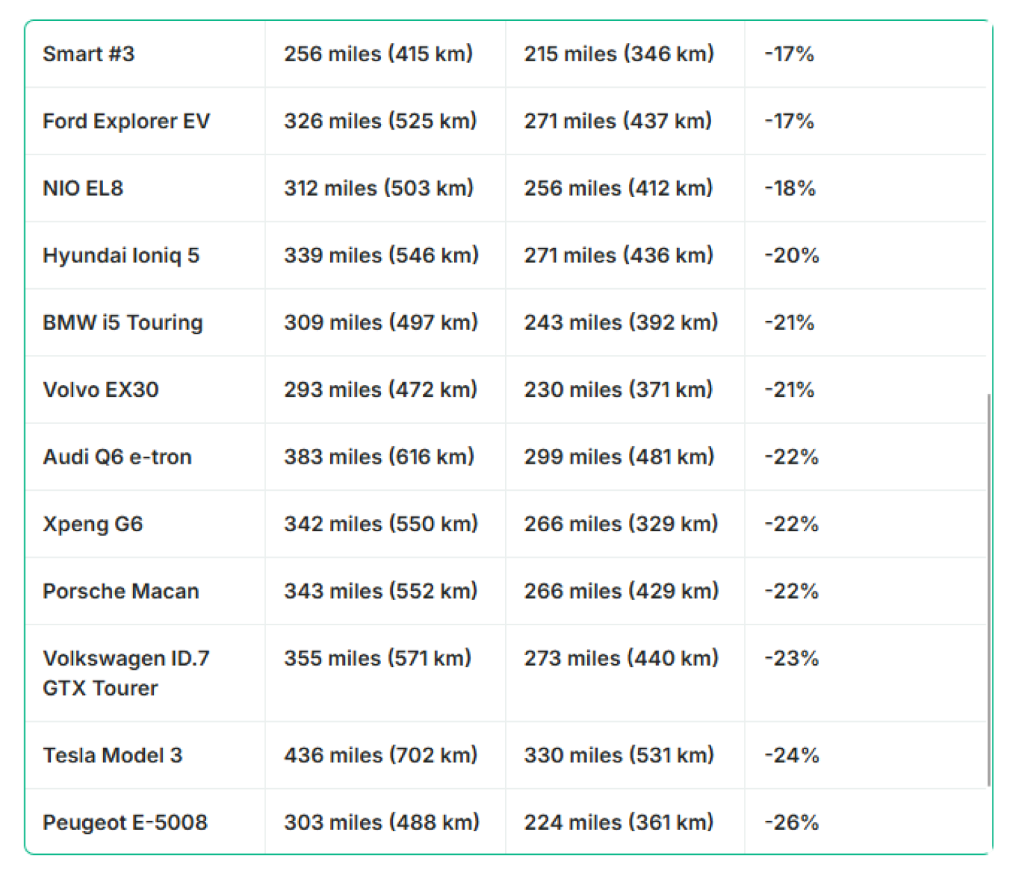 Onder de deelnemende modellen bevonden zich populaire auto’s zoals de Tesla Model 3, Mercedes-Benz G-Klasse, Kia EV3 en Polestar 3. De resultaten lieten een duidelijk patroon zien: alle voertuigen zagen hun actieradius afnemen, maar de mate waarin verschilde sterk per model.
