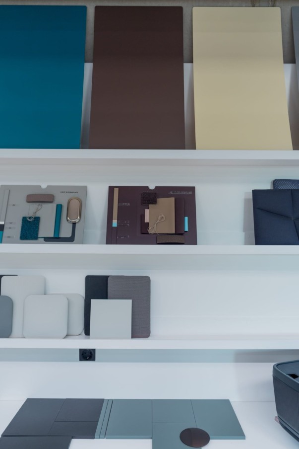 Daarna belanden we in het interieurcentrum. Iemand werkt er aan een nog naamloos concept-deurpaneel, terwijl naast hem tafels vol materiaalstalen liggen: stof, leder, koolstofvezel, aluminium… noem maar op. Die samples tonen welke afwerking, uitstraling en kwaliteit toekomstige modellen moeten krijgen. Het is fascinerend om te zien, maar eerlijk is eerlijk: het maakt nog niet direct de ziel van een auto zichtbaar. Daar zijn de klanten voor nodig.