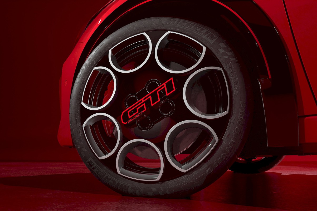 Het uiterlijk is een mix van ingetogen agressie en nostalgische details. De wielkasten zijn breder uitgevoerd om plaats te bieden aan de grotere spoorbreedte en 18-inch lichtmetalen velgen met perforaties, geïnspireerd op de klassieke “gatenwielen” van de 205 GTi 1.9. Een subtiele rode lijn in de voorspoiler, rode accenten op de remklauwen en een zwarte diffuser achter zorgen voor een sportieve uitstraling zonder opsmuk. Ook de kleur ‘GTi-rood’ is een exclusieve lakkleur die direct van de 205 GTi is afgeleid.