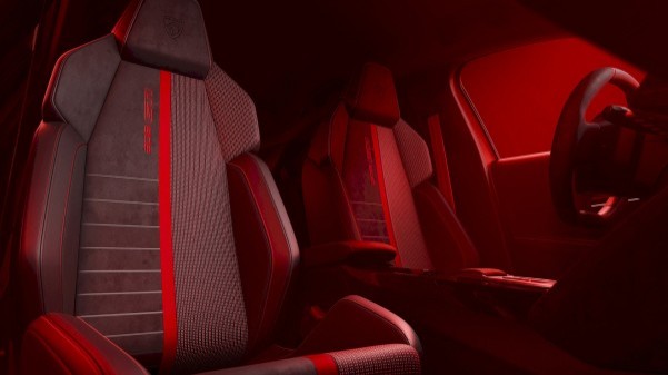 Binnenin valt de rode thematiek direct op: gordels, tapijten en stiksels zijn uitgevoerd in het iconische GTi-rood. De sportstoelen zijn bekleed met een combinatie van Alcantara en mesh, voorzien van geïntegreerde hoofdsteunen en stevige zijdelingse steun. Het compacte stuurwiel is bekleed met geperforeerd rood leder, inclusief GTi-logo.