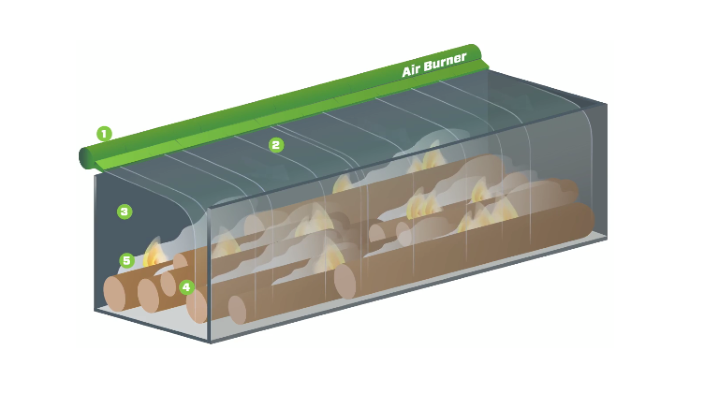 Het principe is eigenlijk heel simpel. Onderin de container wordt het hout verbrand. Dit genereert uiteraard energie, die omgezet wordt in elektriciteit om de laders te voeden. De verbrandingskamer zelf is open, maar van de bovenzijde wordt er zuurstofrijke lucht over de kamer heen geblazen. Het gevolg hiervan is dat de opgestegen rook, asdeeltjes en houtsnippers nogmaals tot verbranding komen. Wanneer de deeltjes klein genoeg zijn, passeren zij pas het luchtgordijn. Omdat de deeltjes echter zo klein zijn, is er geen rook meer zichtbaar. Airburner zelf claimt dan ook dat de lucht tot 80 procent schoner is dan via reguliere verbranding.