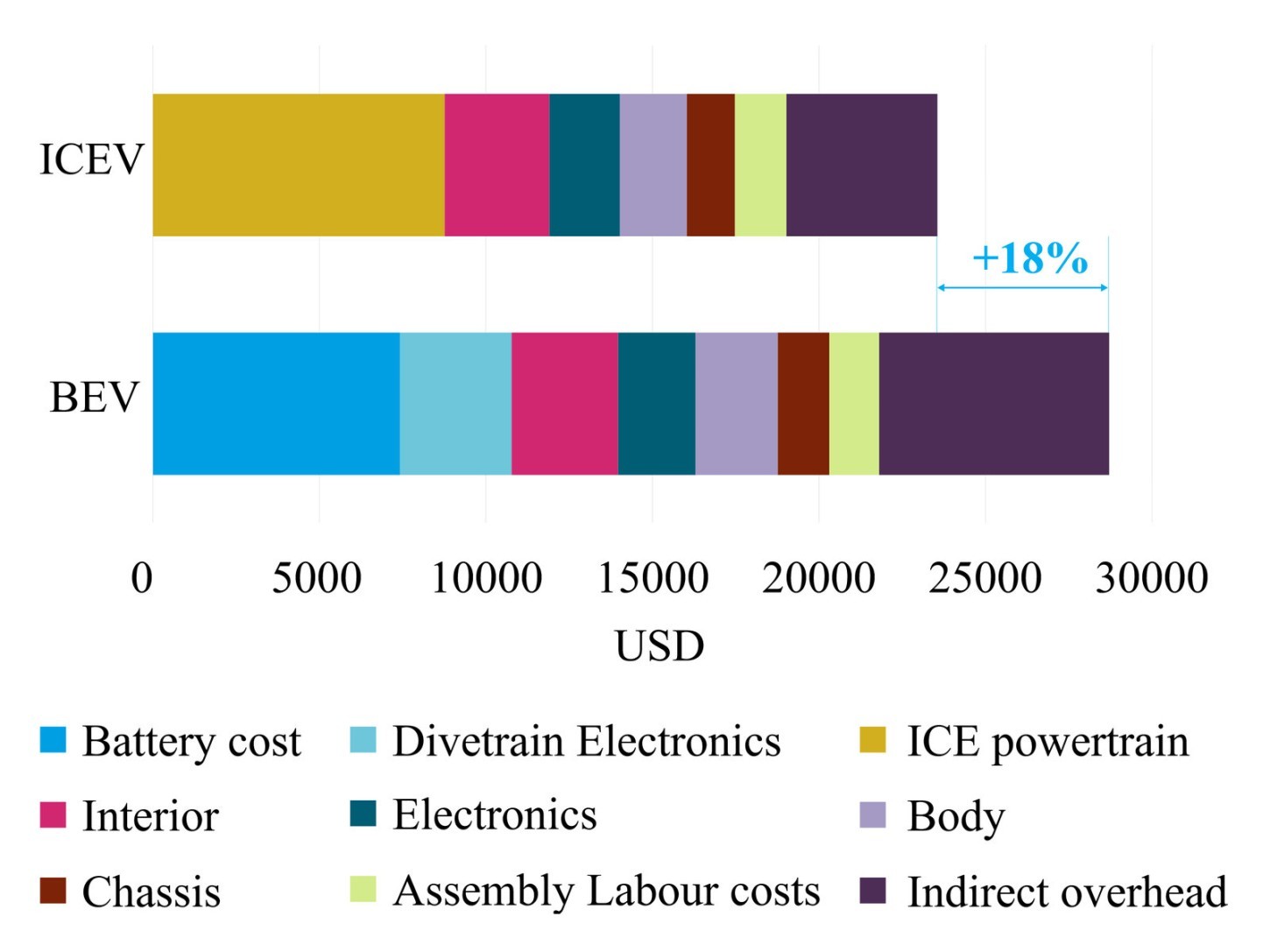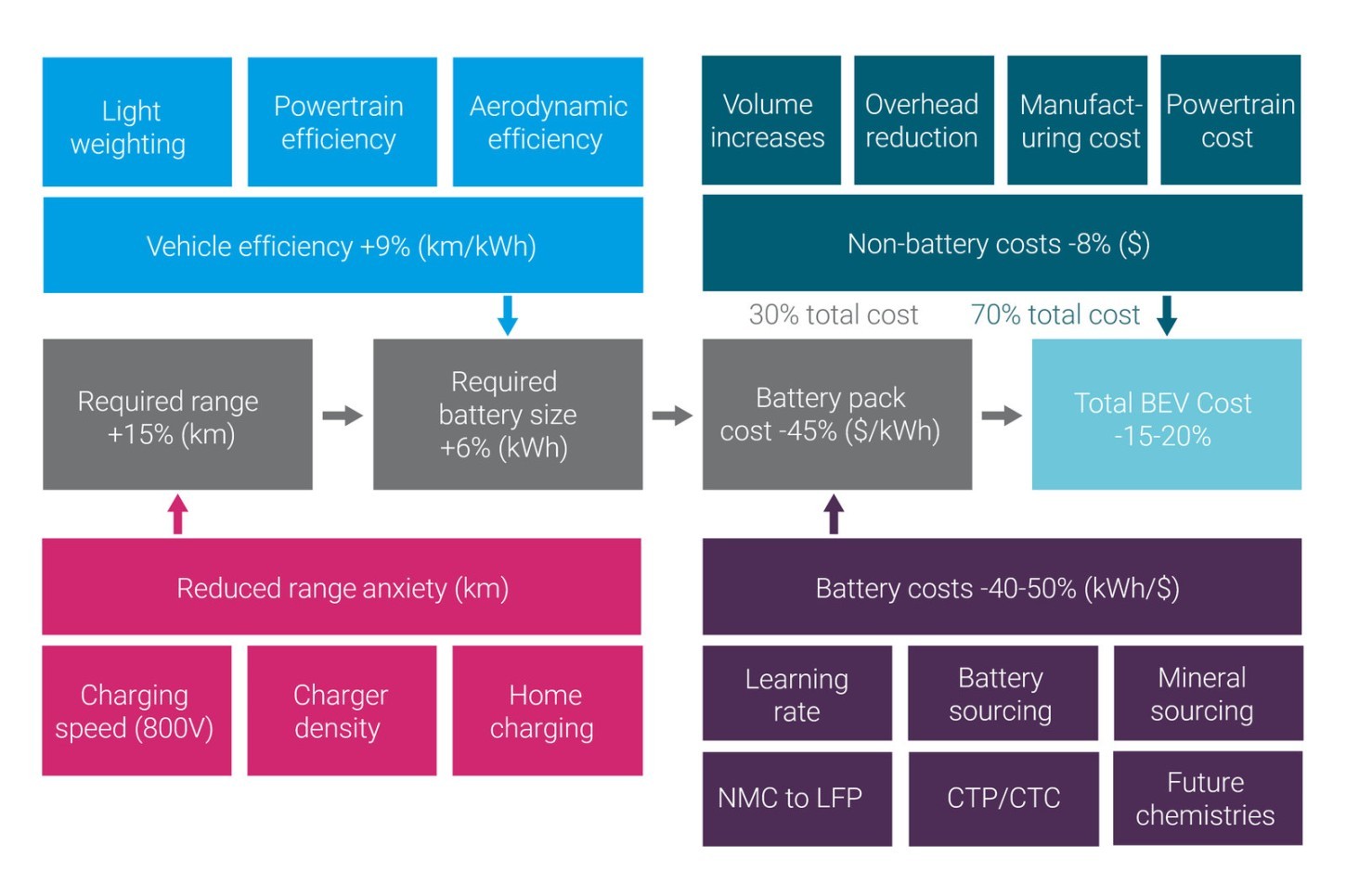 Volgens Columbia Threadneedle Investments is ruim 80% van het huidige kostengat met brandstofauto’s afkomstig is van de aandrijflijn (vooral de accu) en de indirecte overhead. De grootste hefbomen vallen in vier categorieën.