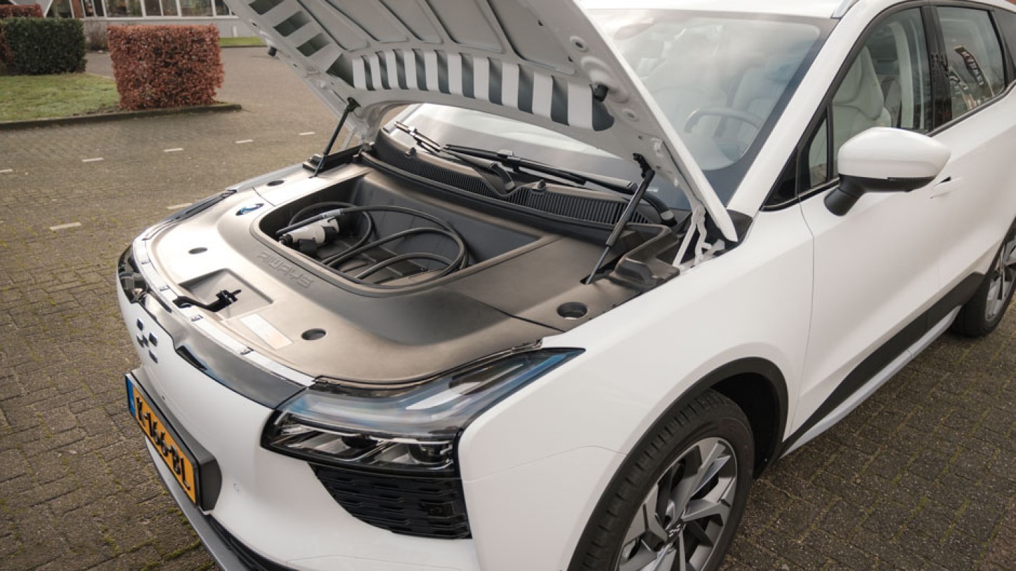 Indien je het voor elkaar hebt gekregen om de bagageruimte volledig af te laden, dan kun je je laadkabel altijd nog onder de motorkap plaatsen in de frunk (front trunk). Ideaal!