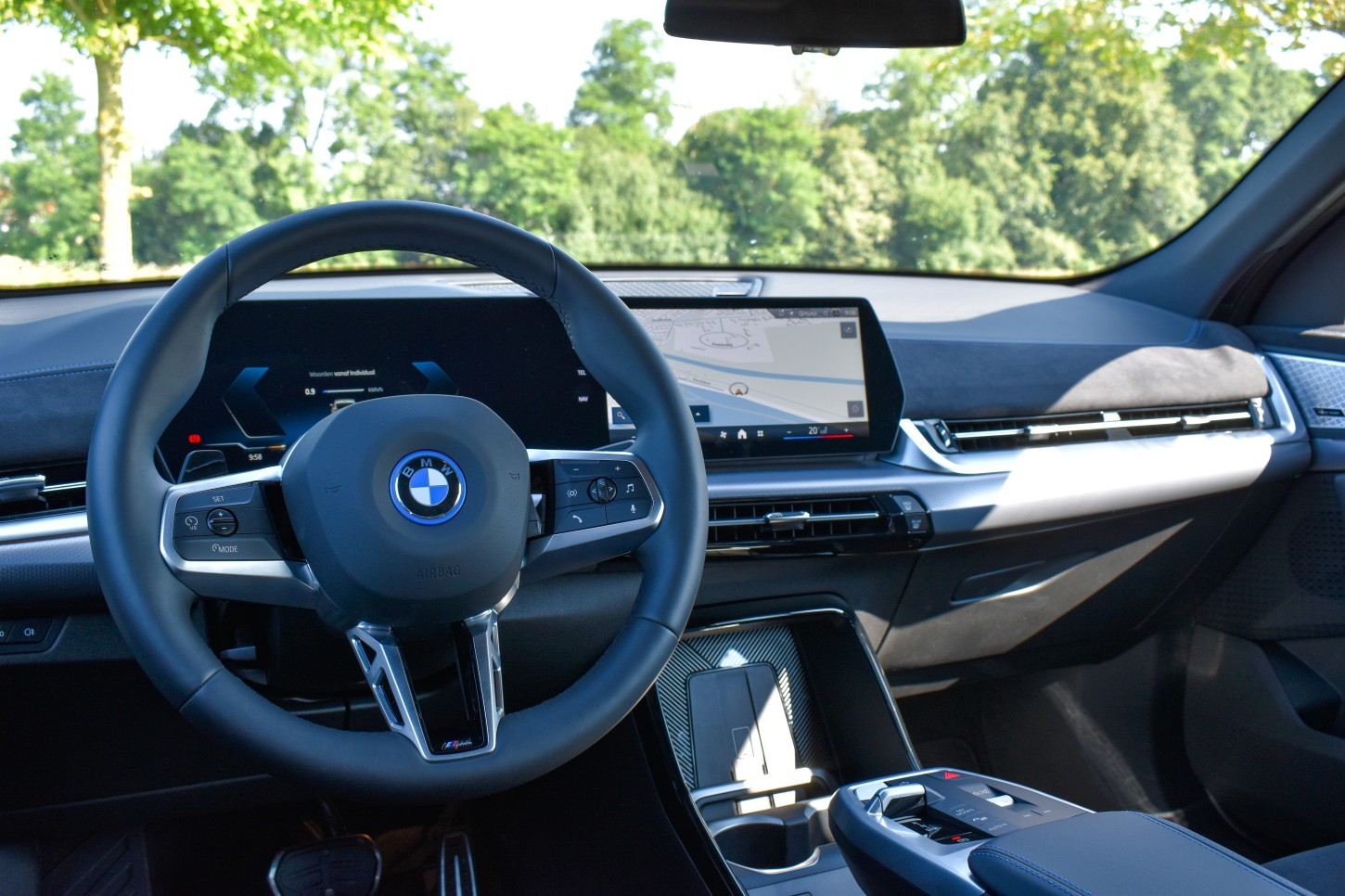 Naast het rijden, weet BMW ook goed hoe ze een interieur moeten bouwen. Steeds meer auto’s hebben een nogal kaal interieur. Een rechttoe rechtaan dashboard met een of meerdere enorme schermen. Nee, bij de iX2 voelt het allemaal wat rijker aan. De geteste iX2 is uitgerust met twee soorten stof op het dashboard, en verschillende sierstrips. De bedieningselementen en het scherm staan naar de bestuurder gericht. Dat geeft een meer aangekleed en huiselijk gevoel. Ook prettig: de temperatuur inclusief + en - hebben een vaste plek onderin het scherm.