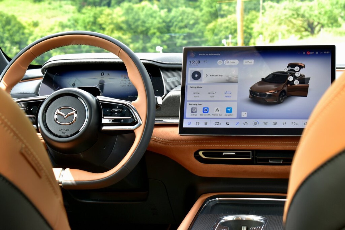 Dat zie je vooral door de indeling van het interieur. Een hoge middentunnel met daarboven een 14,6 inch groot scherm dat lijkt te zweven. Mazda staat juist bekend om zijn relatief bescheiden schermen, die mooi weggewerkt in het dashboard zitten en te bedienen zijn via een draaiknop. Helaas ontbreken deze typische Mazda-kenmerken.