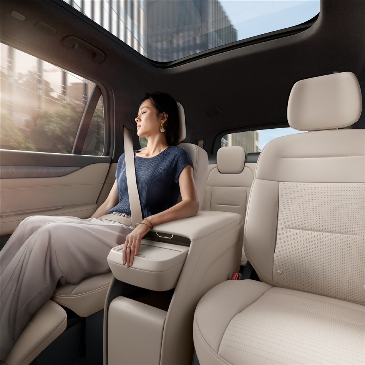 Eerlijk gezegd is wel even goed kijken om de EL8 te herkennen ten opzichte van zijn SUV broertjes. Hij is wel langer (<20 cm) t.o.v. de EL7 die weer 6 cm langer is dan de EL6. Opvallend genoeg is de EL6 wel de breedste van alle drie én heeft hij de grootste bagageruimte, al is dat enkel met een miniem verschil. De EL8 moet het van andere zaken hebben. Zijn prijs is er wel en niet één van. Hij is slechts twee duizend euro duurder dan de EL7 en daarvoor krijg je één zitplek meer en meer snellaad snelheid. Die zitplek meer wordt gecreëerd door de derde zitrij. Dat zijn twee extra zitplekken die zelfs een eigen airconditioning-instelling heeft. Met die +2 zou je uitkomen op 7 zou je denken, alleen op de tweede zitrij wordt daar één plek weggehaald. Je hebt daar namelijk twee aparte stoelen die zelfs een voetensteun hebben en ook elk gescheiden airconditioning. Als je de stoelenleuningen naar achteren kantelt, dan zit je al snel tegen de binnenkant van de auto aan. Door de zitting verder naar voren te schuiven, kan de leuning iets platter worden geplaatst. Liever hadden we gezien dat het echt businessclass was en je de leuning helemaal plat kunt leggen voor een echte businessclass ervaring. Kies je voor de Executive uitvoering, dan krijg je zelfs een luxe een middenconsole met een verschuifbaar paneel met twee vakken om je smartphone draadloos op te laden, met daaronder een koelkast! Deze kun je via het touchscreen tussen de voorstoelen elektrisch openen. Daarna moet je hem nog wel zelf naar voren trekken. Een koelkast is overigens niet de juiste benaming ervoor. Je kunt er ook producten tot 50 graden Celsius warm houden. De afhaalchinees bijvoorbeeld…